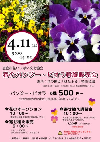恵庭市花いっぱい文化協会が主催し、窓辺やお庭を花々で彩ってもらおうと、市内の生産者が育てた良質なパンジーやビオラ、寄せ植えなどが販売されます。